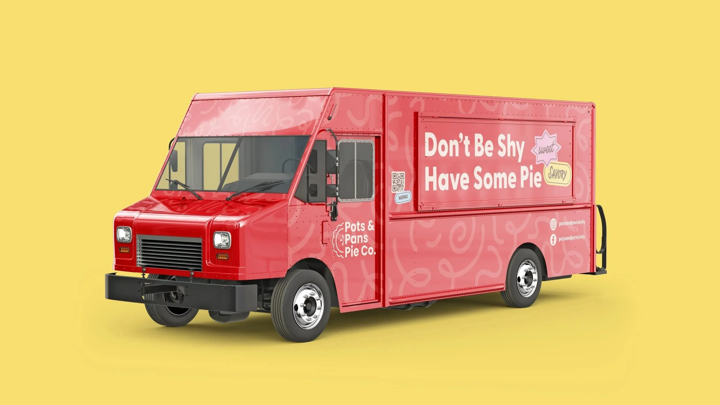 This project focused on transforming a local shop, Pots & Pans Pie Co., into a mobile dining experience through cohesive branding and design. A comprehensive visual system for a food truck, including the truck wrap, menu board, and to-go packaging, was created to ensure all elements reflected the restaurant’s identity and style.
